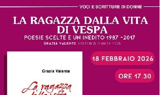 Casa delle Donne e Biblioteche delle donne di Láadan, MERCOLEDI’ 18 FEBBRAIO 2026 ORE17,30 presso Láadan, centro culturale e sociale delle donne , Via Vanchiglia 3 – Torino, per il ciclo “Voci e scritture di donne” presentano La ragazza dalla vita di vespa. Poesie scelte e un inedito 1987-2017 di Grazia Valente. In dialogo con l’Autrice Anna Cagna della Casa delle Donne